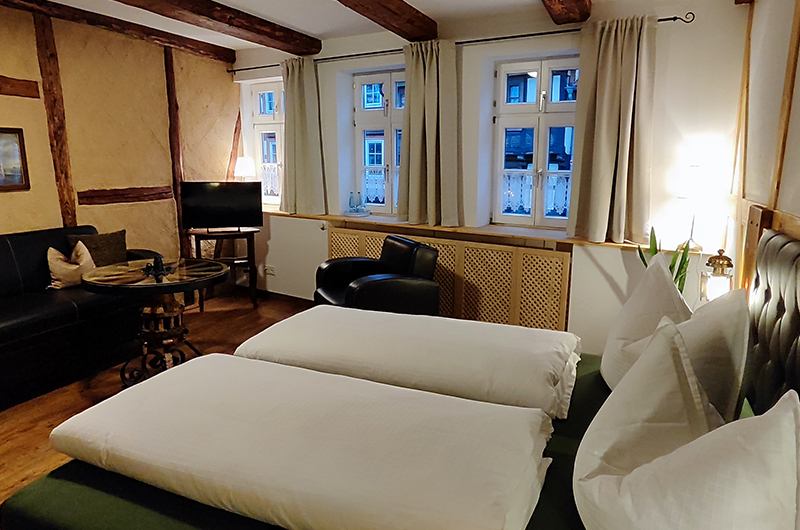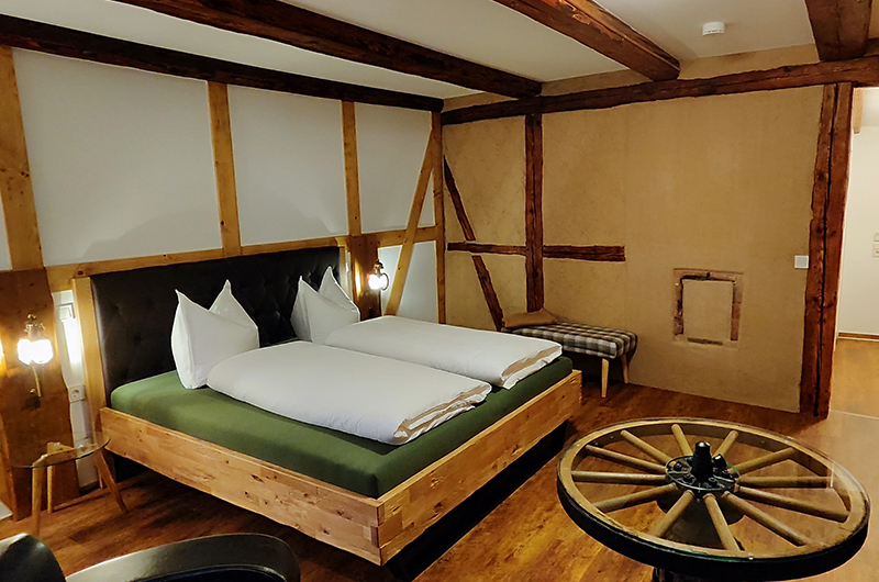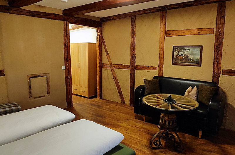 Unser Kutscherzimmer lässt Sie in die Vergangenheit zurückreisen. Lehm- und steinverputzte Wände mit sichtbaren Balken im Flur, Bad und Schlaf-Wohnraum lassen die Ursprünge des Hauses wieder aufleben.