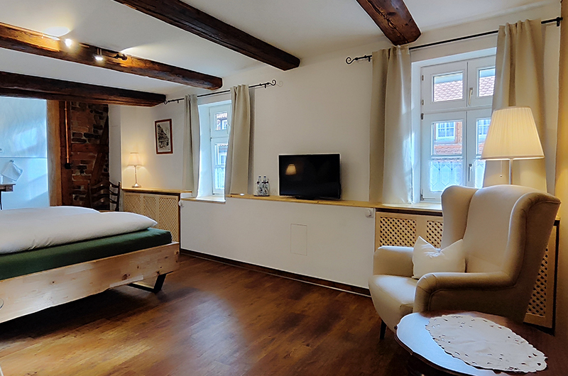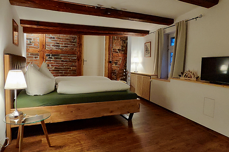Über einen kleinen Flur mit Garderobe gelangt man in den Schlaf-Wohnbereich mit großem Doppelbett und im Anschluss ins Badezimmer. Als unverwechselbarer Blickfang dienen die Original-Lehm- und Ziegelwände.