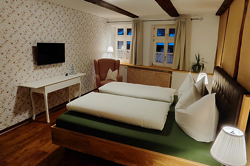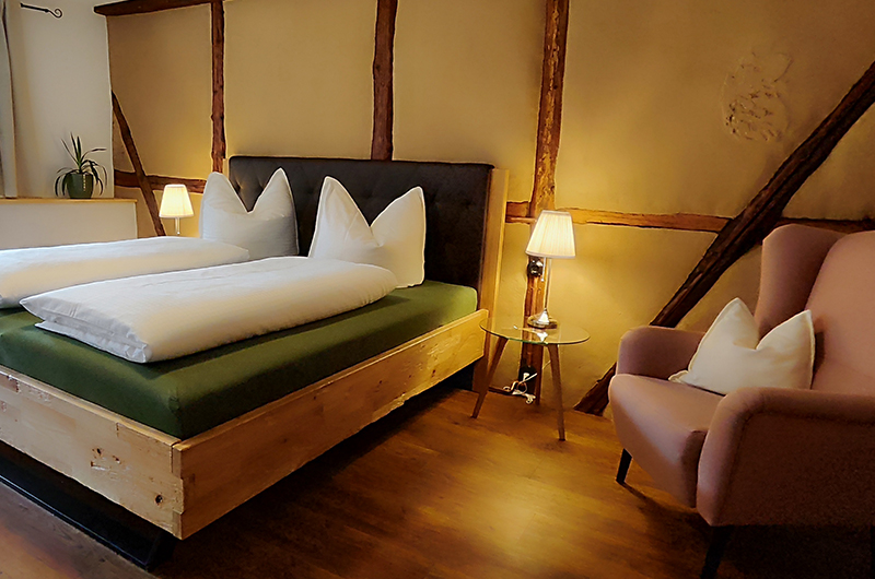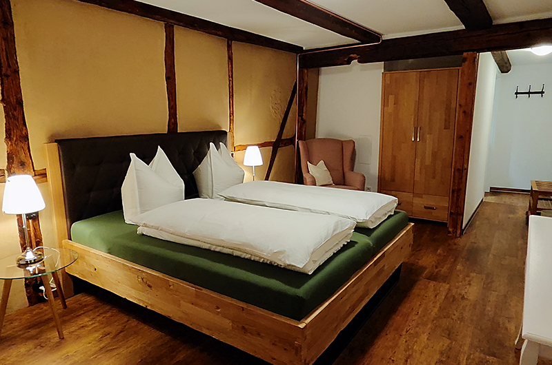 Das Zimmer zeigt in Richtung Geschäftsstraße. Das große Doppelbett und zwei bequeme Sessel laden zum Verweilen ein.
