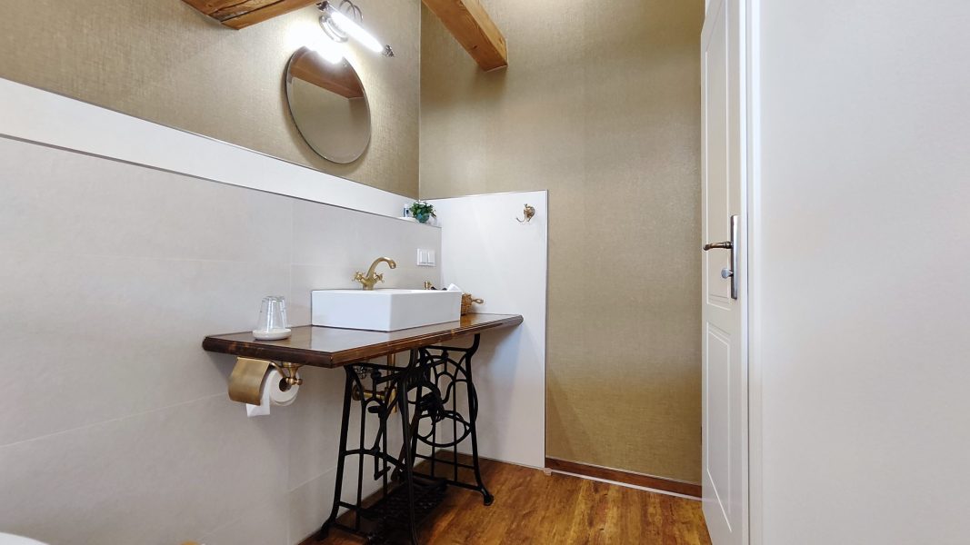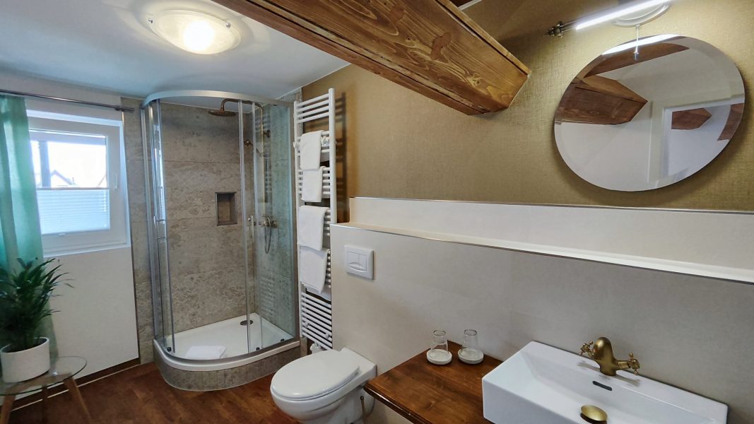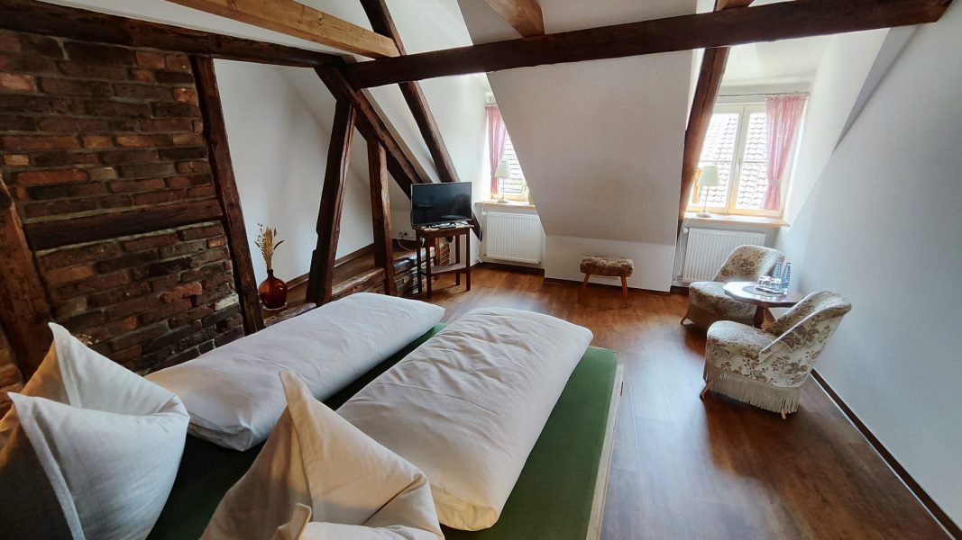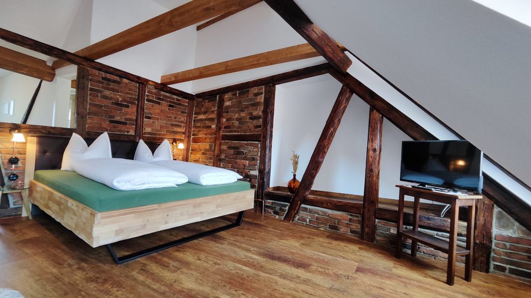 Vom Eingang aus gelangt man links in das Badezimmer und gerade zu in den Schlaf- Wohnbereich mit gemütlichem Doppelbett und mit Ziegeln ausgemauerte Fachwerkwände.