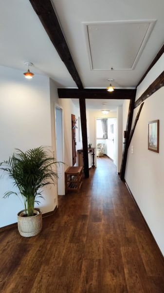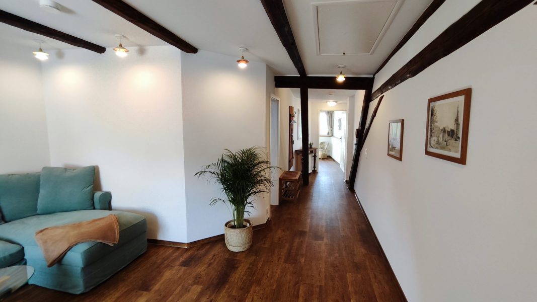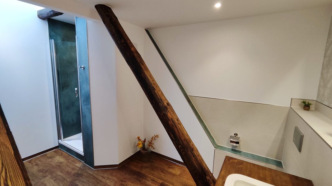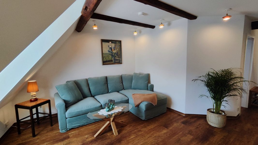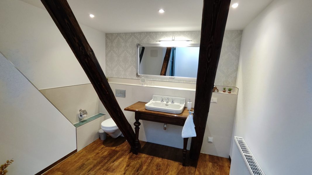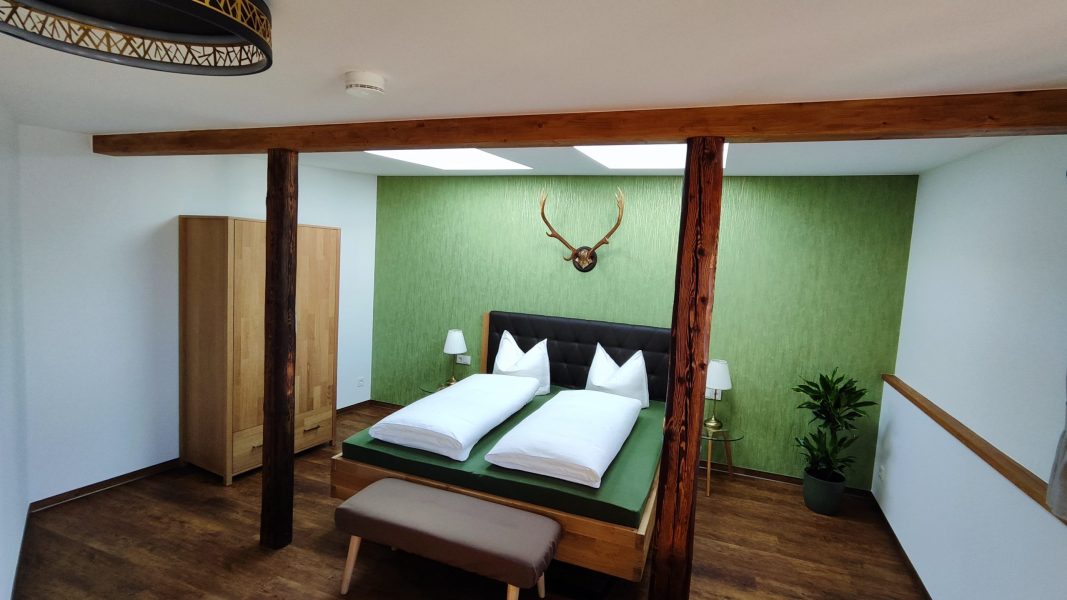 Das Schlafzimmerer liegt ruhig zum Innenhof. Es bietet eine unverwechselbare Sicht über die Dächer von Wernigerode. Im Sommer kann man den Sonnenuntergang genießen.