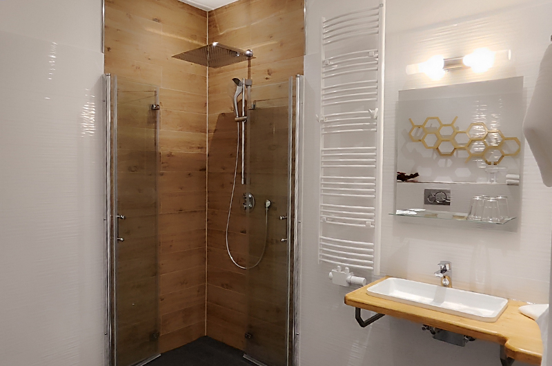 Das Bad verfügt über eine stufenlose Dusche und ein unterfahrbares Waschbecken.