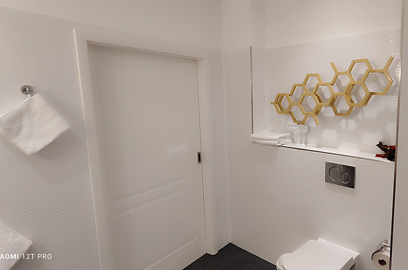 Die Fenster sind schallgeschützt. Mittels elektrischer Rollos kann man das Zimmer komplett verdunkeln.